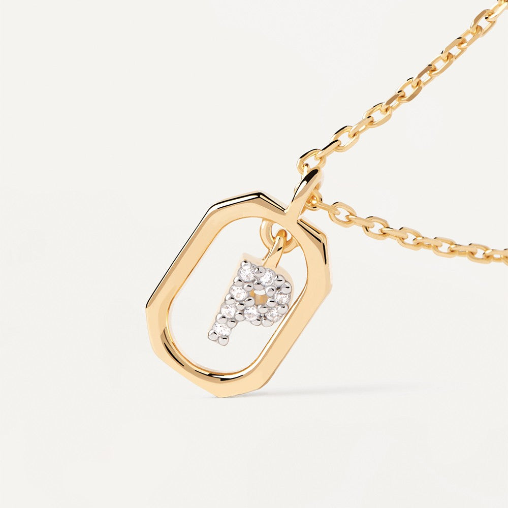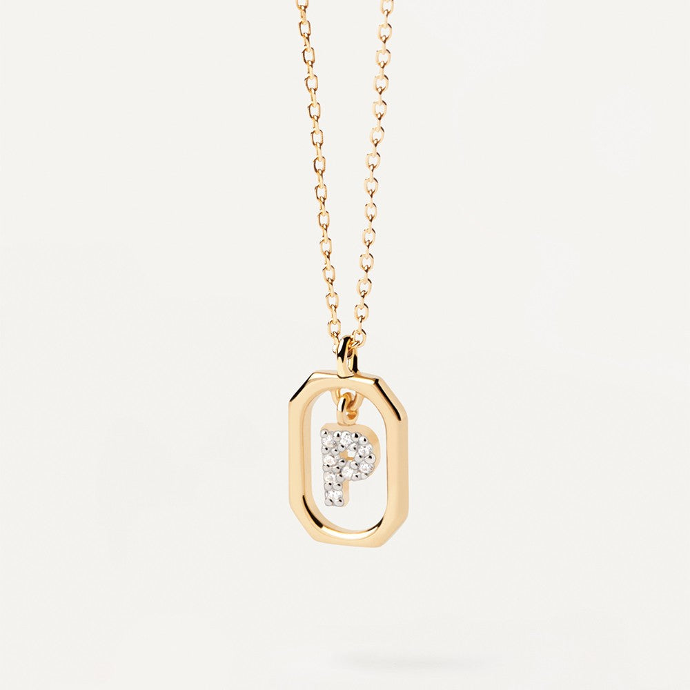 Collana con ciondolo di forma ottagonale con Lettera P in zirconi. La collana è in Argento 925 placcato in oro 18kt e fa parte della collezione Mini Letters di PDPaola.