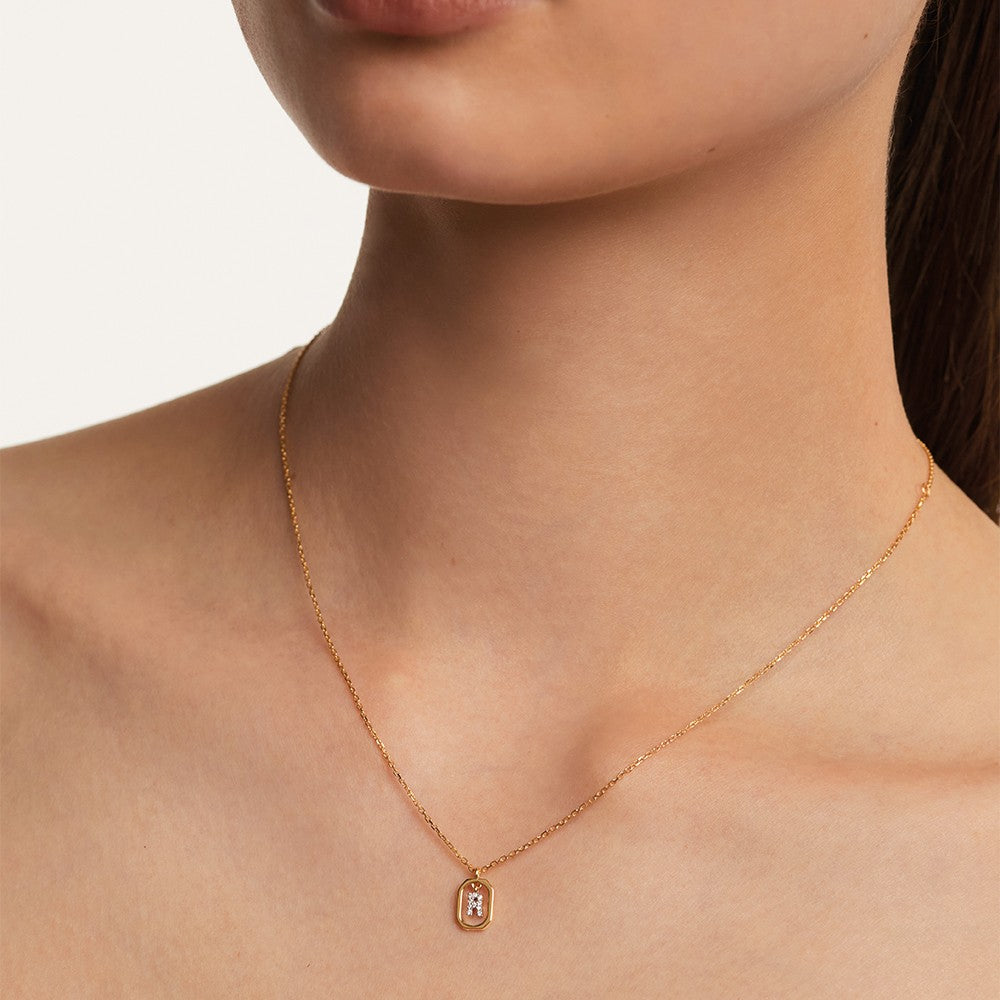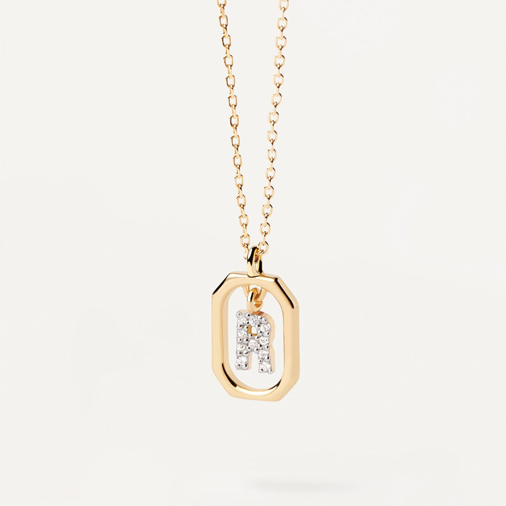 Collana con ciondolo di forma ottagonale con Lettera R in zirconi. La collana è in Argento 925 placcato in oro 18kt e fa parte della collezione Mini Letters di PDPaola.