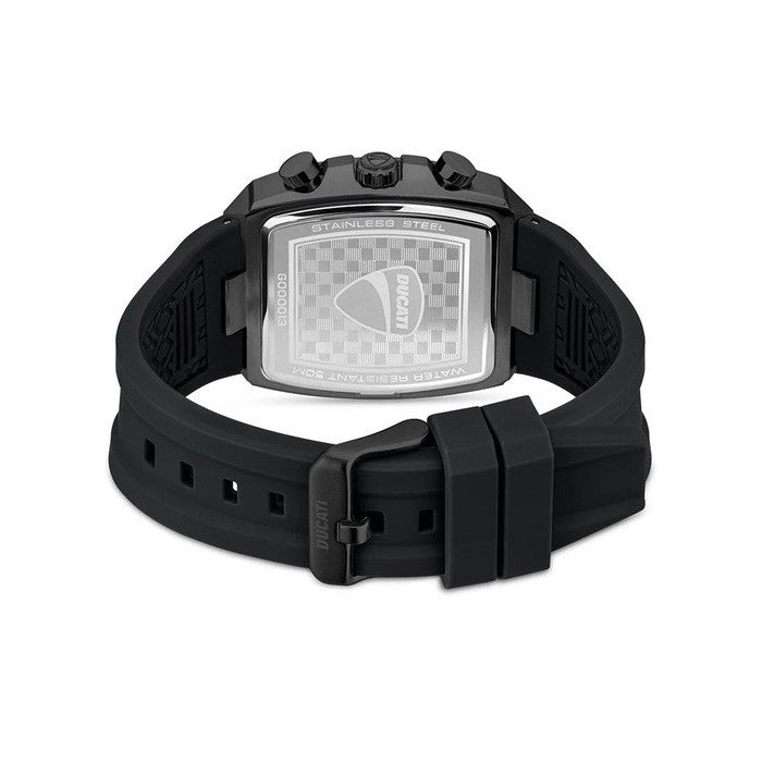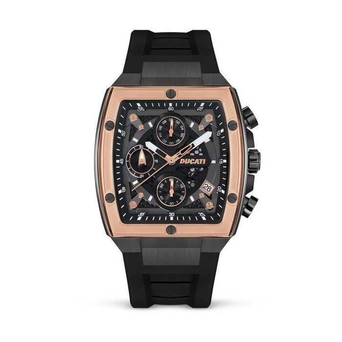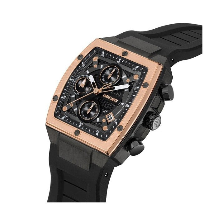 Orologio da uomo Chrono Ducati Dt008 Black Dial Bk Case: cronografo al quarzo con cassa tonneau IP nera da 40 mm, quadrante nero-rosa e cinturino in silicone nero. Design sportivo Made in Italy.
