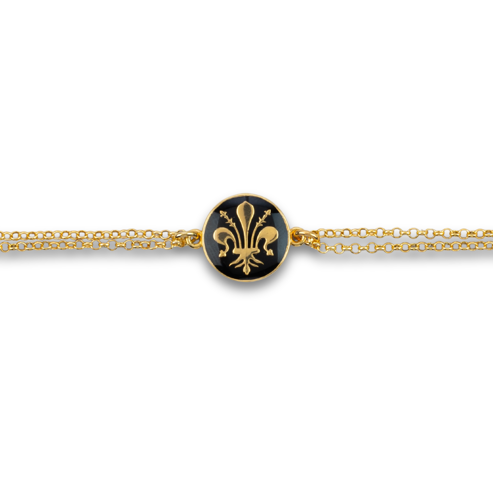 Bracelet with plate Florentine Lily in 925 silver, 24Kt gold plating and black enamel (hand-decorated hot enamel). The Florentine Lily is historically associated with freedom and the very name of the city. Handcrafted jewel entirely made in Italy.