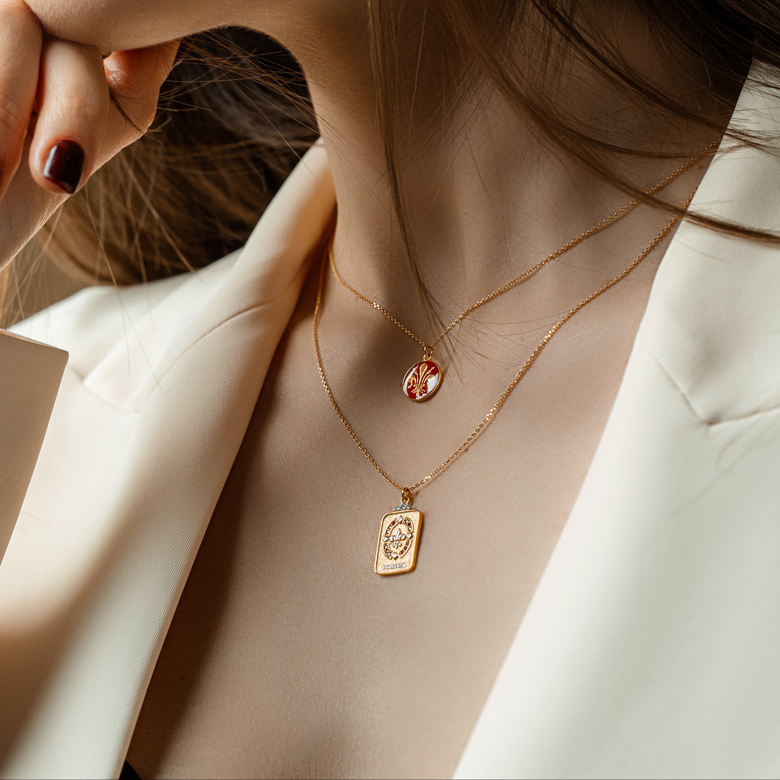 Necklace with Florence Lily Tag, in 925 silver, 24kt gold galvanic, bordered with emerald zircons. The Florence Lily is historically associated with freedom and the very name of the city. Handcrafted jewel entirely made in Italy.