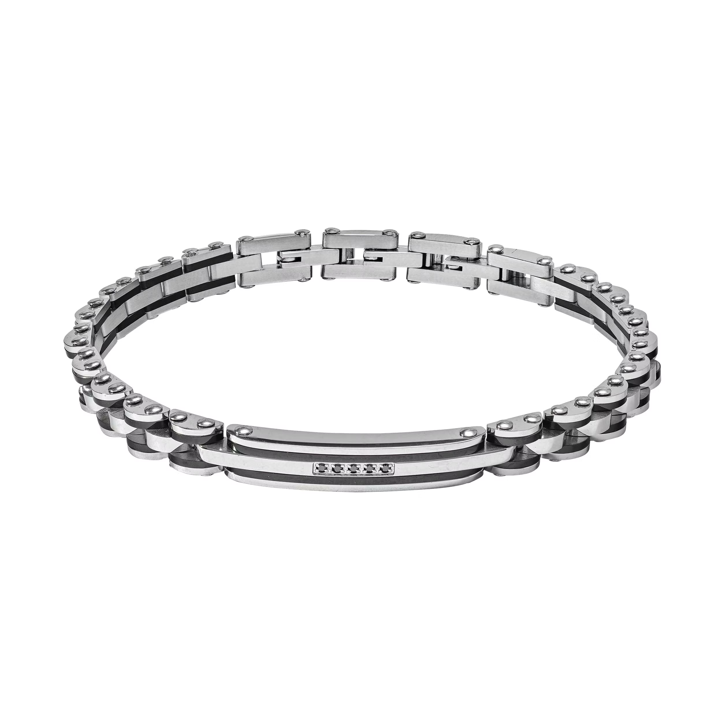 Il bracciale da uomo della Collezione Zip di Comete Gioielli è realizzato in acciaio con trattamento PVD nero ed è impreziosito da zirconi neri luminosi nel centrale.