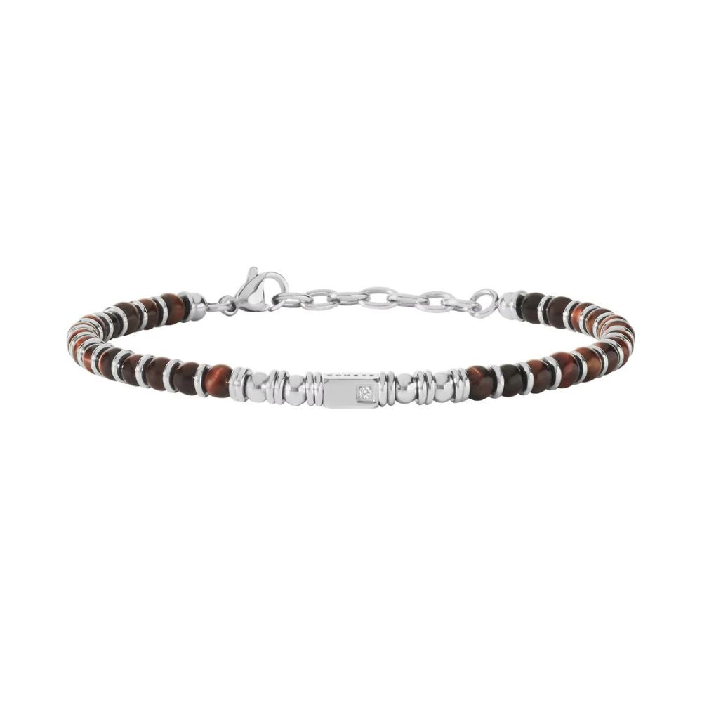 Il bracciale da uomo della Collezione District di Comete Gioielli unisce acciaio, pietre naturali occhio di tigre e uno zircone bianco, creando un accessorio dal carattere moderno e maschile.