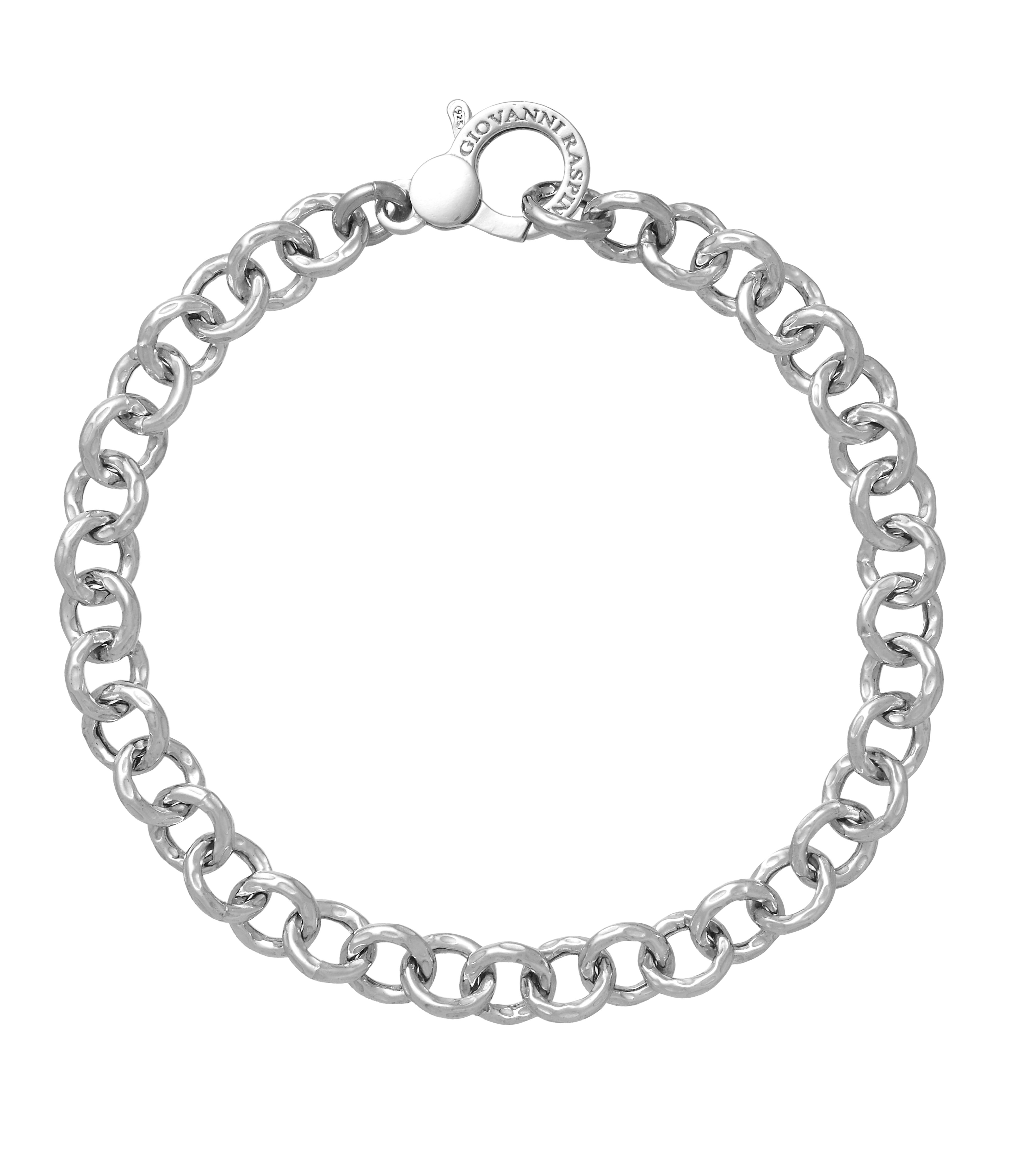 Texture bold e artigianale: il bracciale maglia martellata del brand Giovanni Raspini in argento 925, lungo 20 cm, incarna lo spirito toscano con lavorazione a mano. Design industrial-chic, accessibile e versatile per stack o solo.