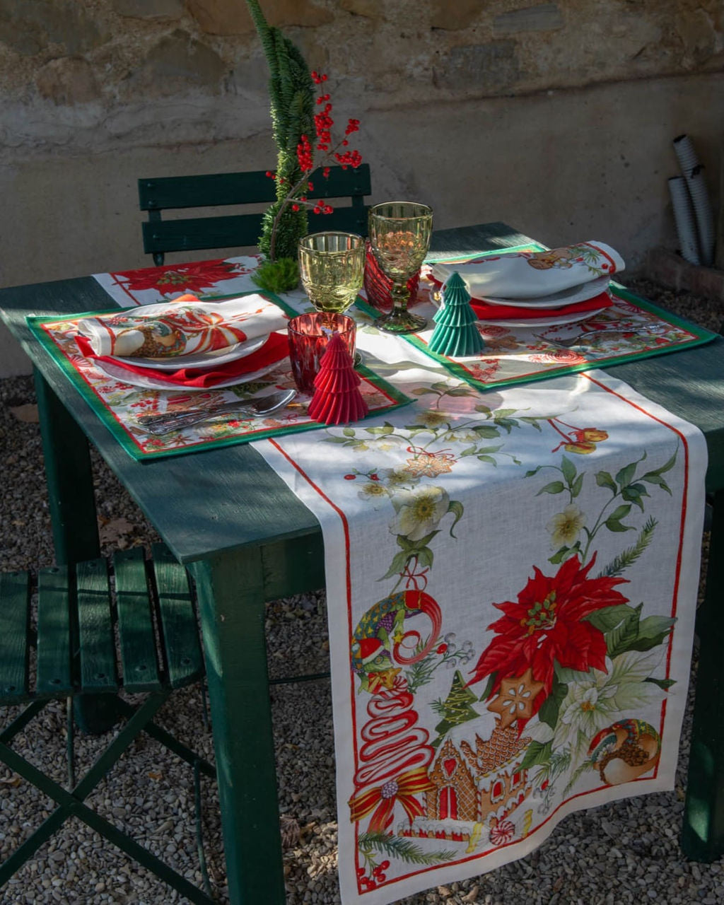 Il runner natalizio MARZAPEPE di Tessitura Toscana Telerie cattura la magia del Natale con stelle di Natale rosse, bacche e biscotti allo zenzero che decorano un raffinato tessuto in 100% lino. Elegante e gioioso, dona alla tavola un tocco fiabesco e accogliente, evocando i profumi e i ricordi più dolci delle feste. Perfetto per chi ama un Natale autentico, caldo e ricco di tradizione artigianale.