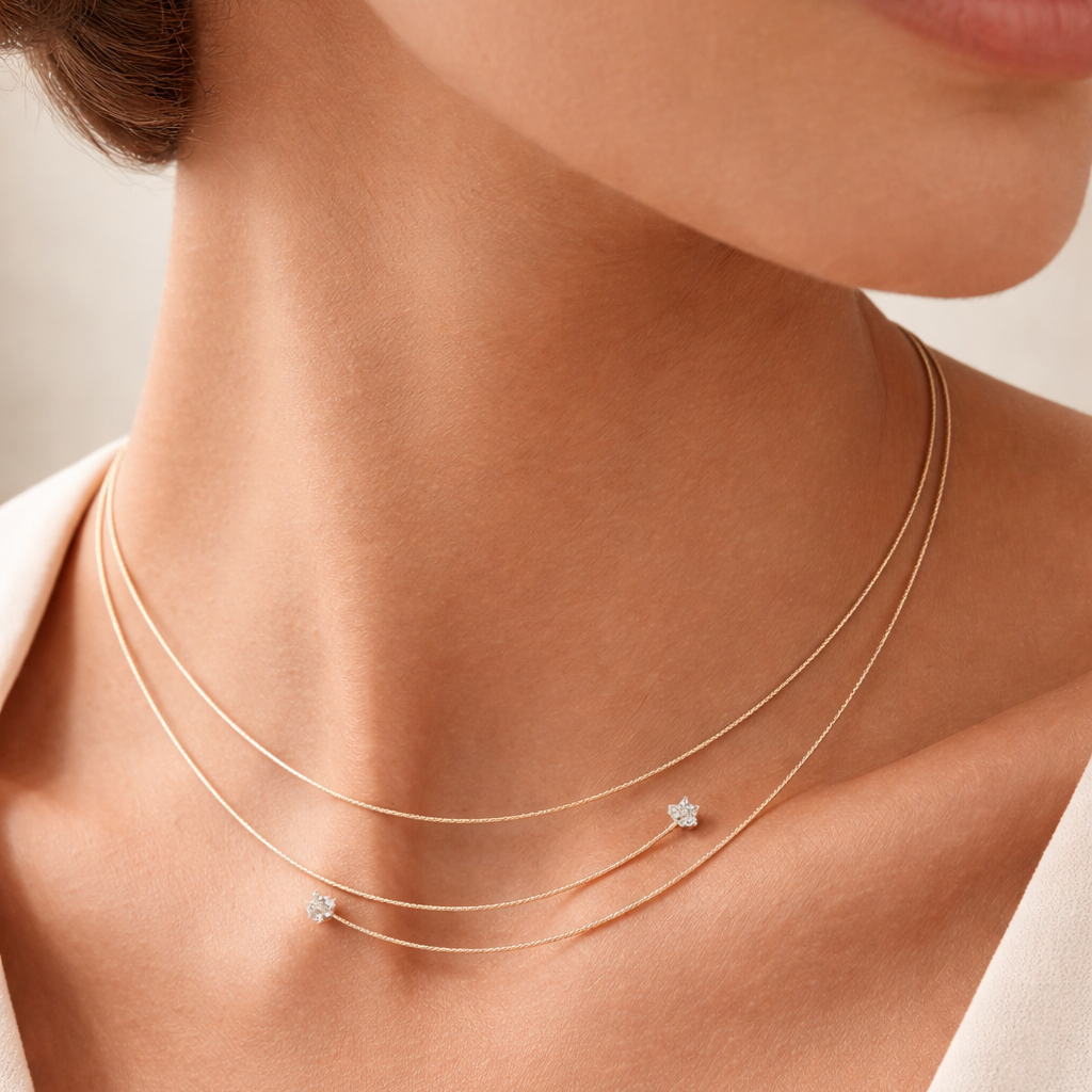The Silenzio yellow gold diamond necklace features a simple, sophisticated design. The double line delicately wraps around the neck, while the stones provide a subtle sparkle. Perfect as a diamond necklace for everyday wear or for special occasions, this refined piece exudes contemporary elegance.