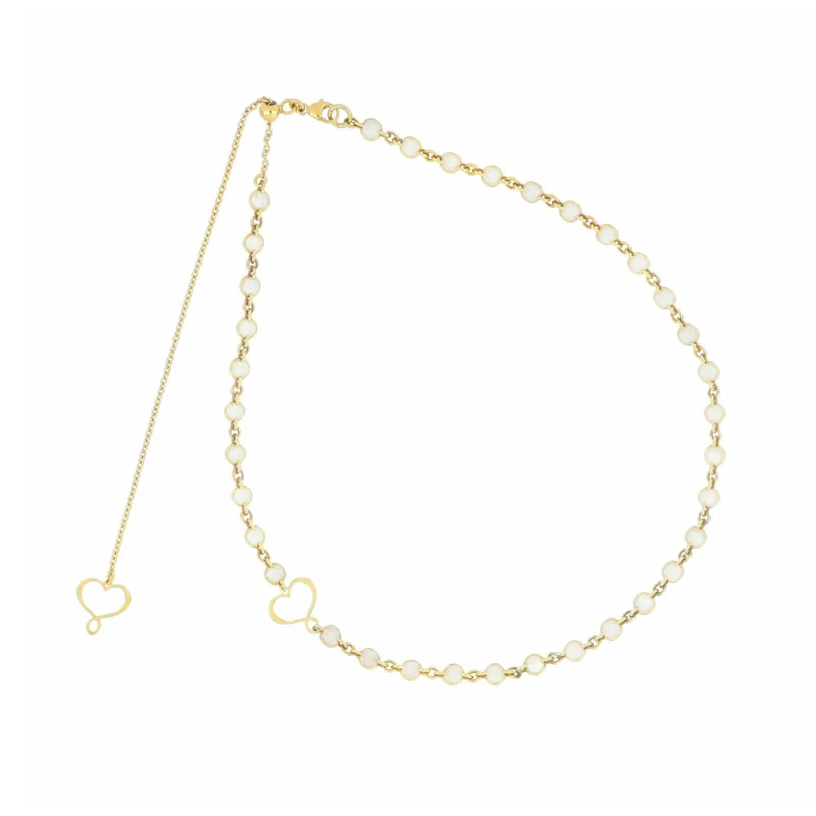 Sulla catena è presente il cuore Maman traforato, simbolo distintivo del brand, che aggiunge una nota di delicatezza al design. La lunghezza della collana è regolabile da 31 cm a 44 cm grazie alla piccola sfera scorrevole, per una vestibilità personalizzabile. La chiusura a moschettone garantisce comfort e sicurezza, mentre l'estremità del gioiello è decorata con il cuore Maman traforato pendente, per un tocco finale di classe.