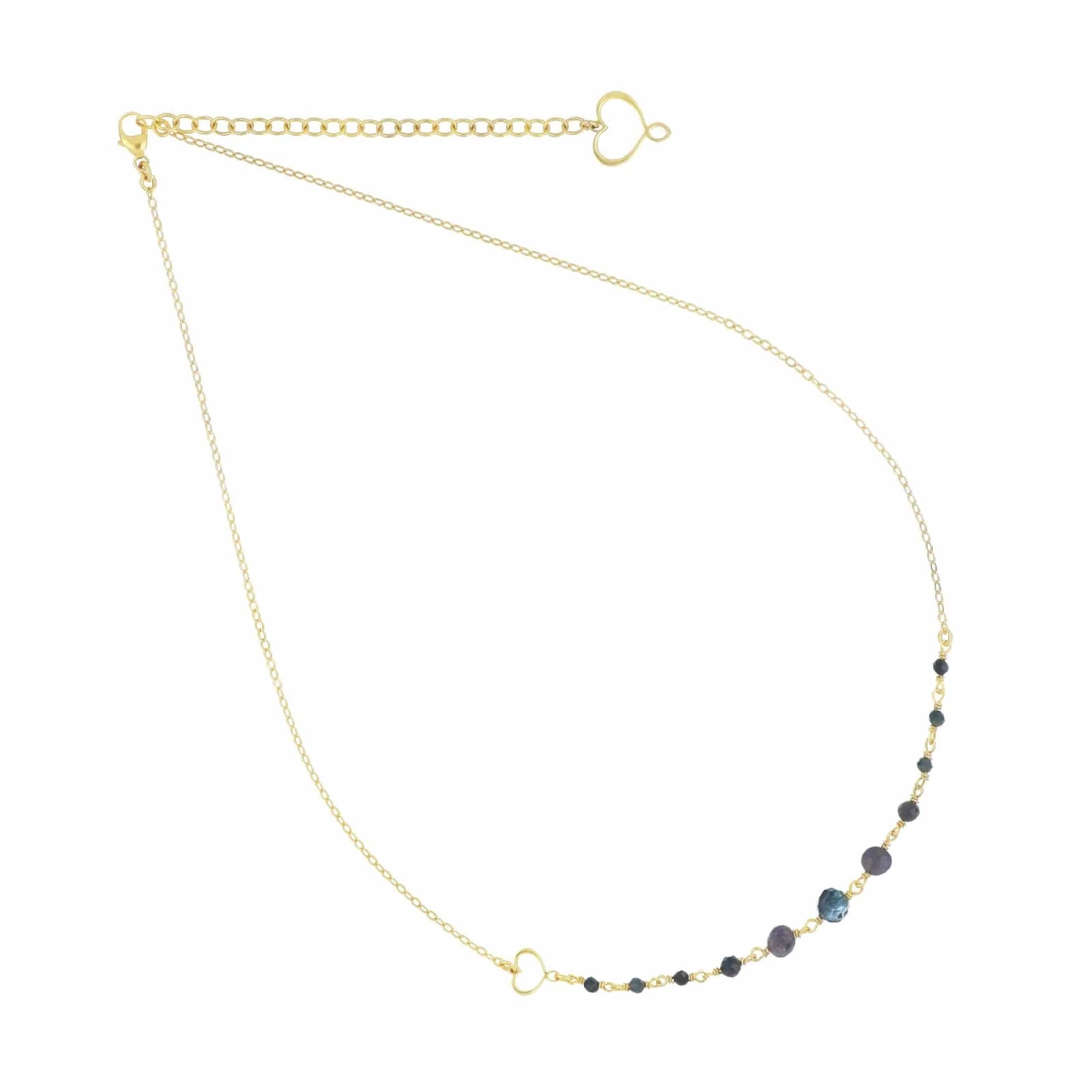 La collana girocollo in argento dorato con pietre blu di Maman et Sophie è un gioiello elegante e sofisticato che gioca con la luce e i colori. Realizzata in argento 925 ‰ con galvanica oro ad alto spessore e resistenza, questa collana è decorata con una selezione di pietre preziose: zaffiro blu, iolite e acquamarina scura, sfaccettate in diverse dimensioni, che creano un effetto luminoso e vibrante.
