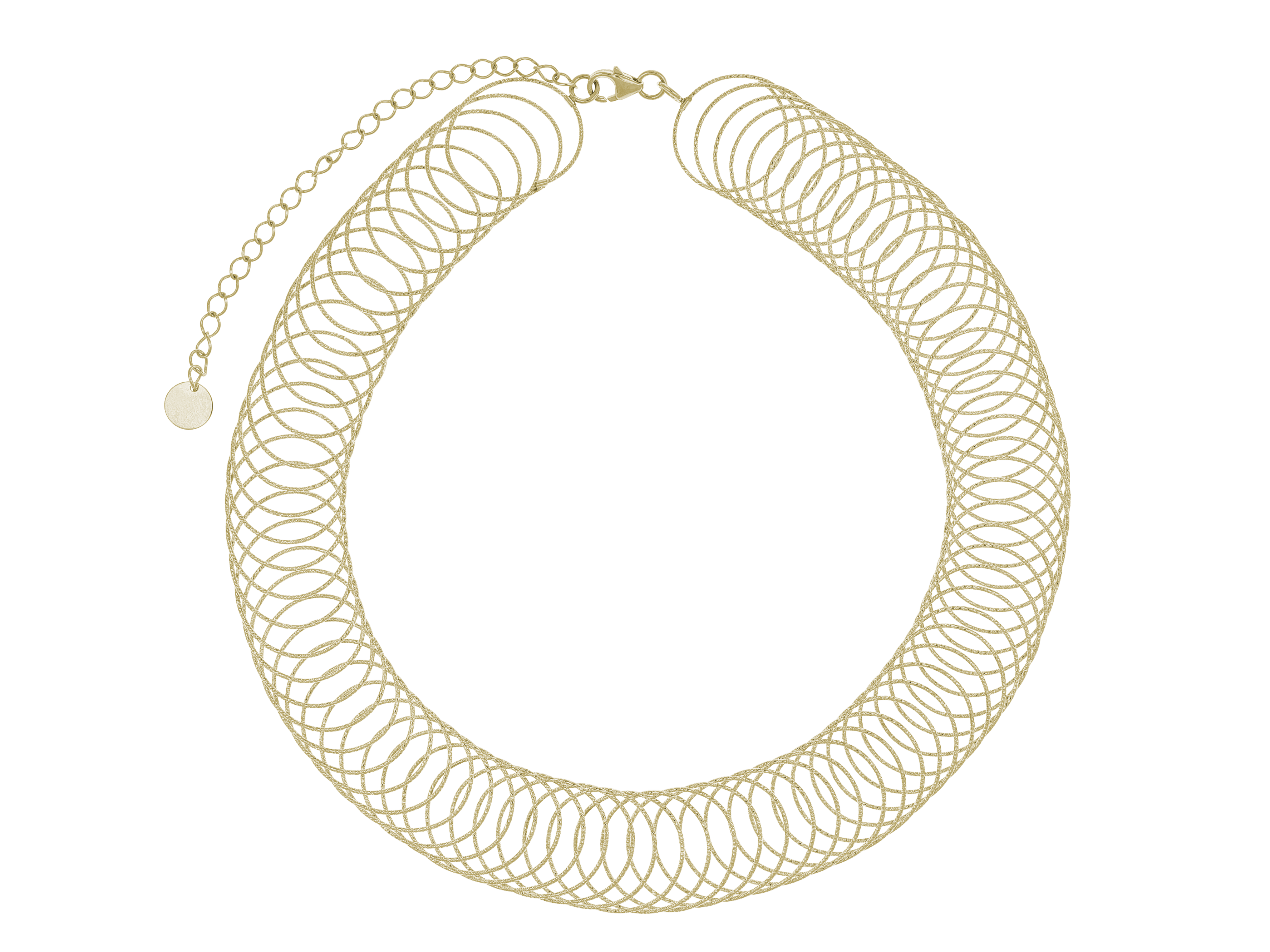 Vortex necklace in yellow gold with a bold, sculptural design, featuring a visually striking, enveloping finish. The bold structure accentuates the décolleté with contemporary elegance. Perfect as a designer gold necklace for those who love distinctive, characterful jewelry. An iconic piece with a strong personality.