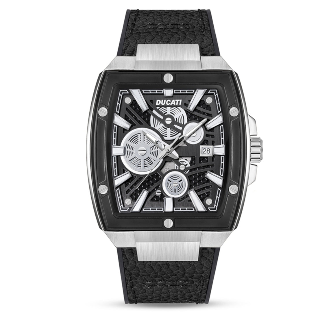 Orologio Ducati Corse by Locman in acciaio con quadrante nero scheletrato e cinturino in pelle con interno in silicone. Design ispirato ai motori Ducati per un carattere sportivo e deciso.