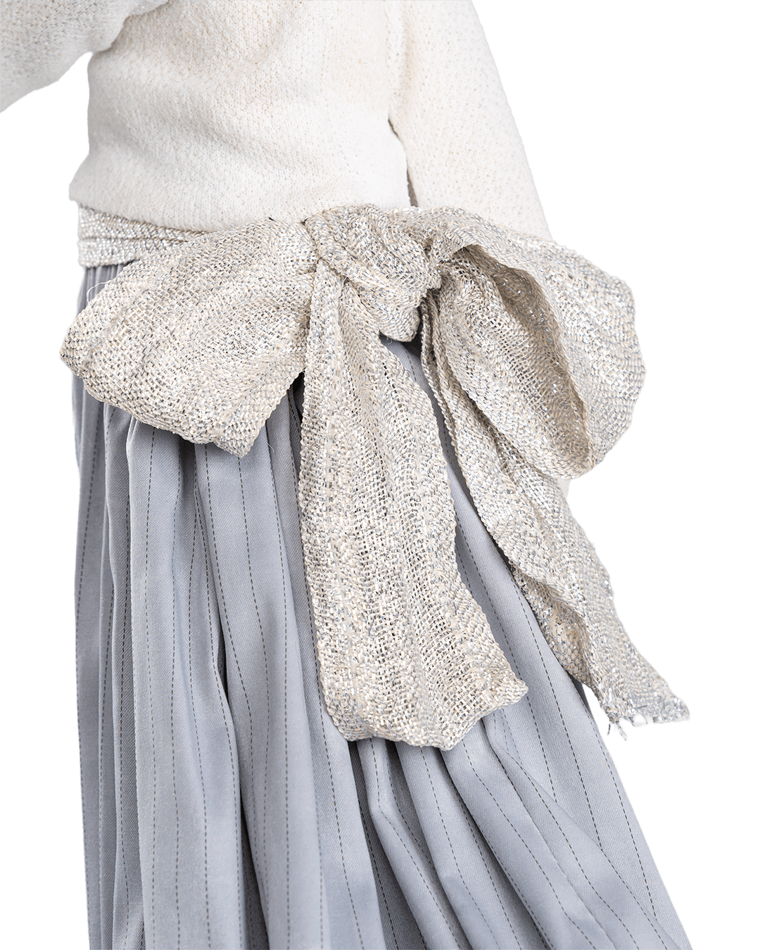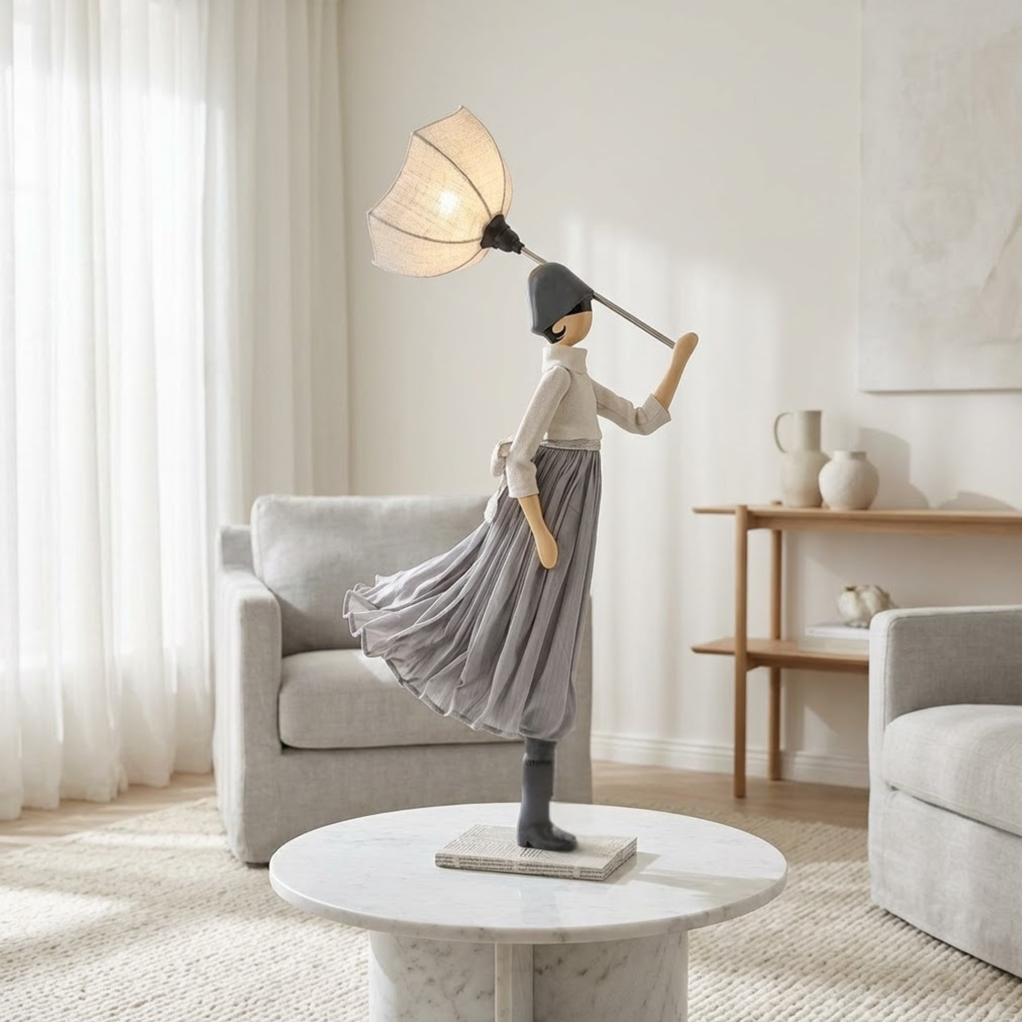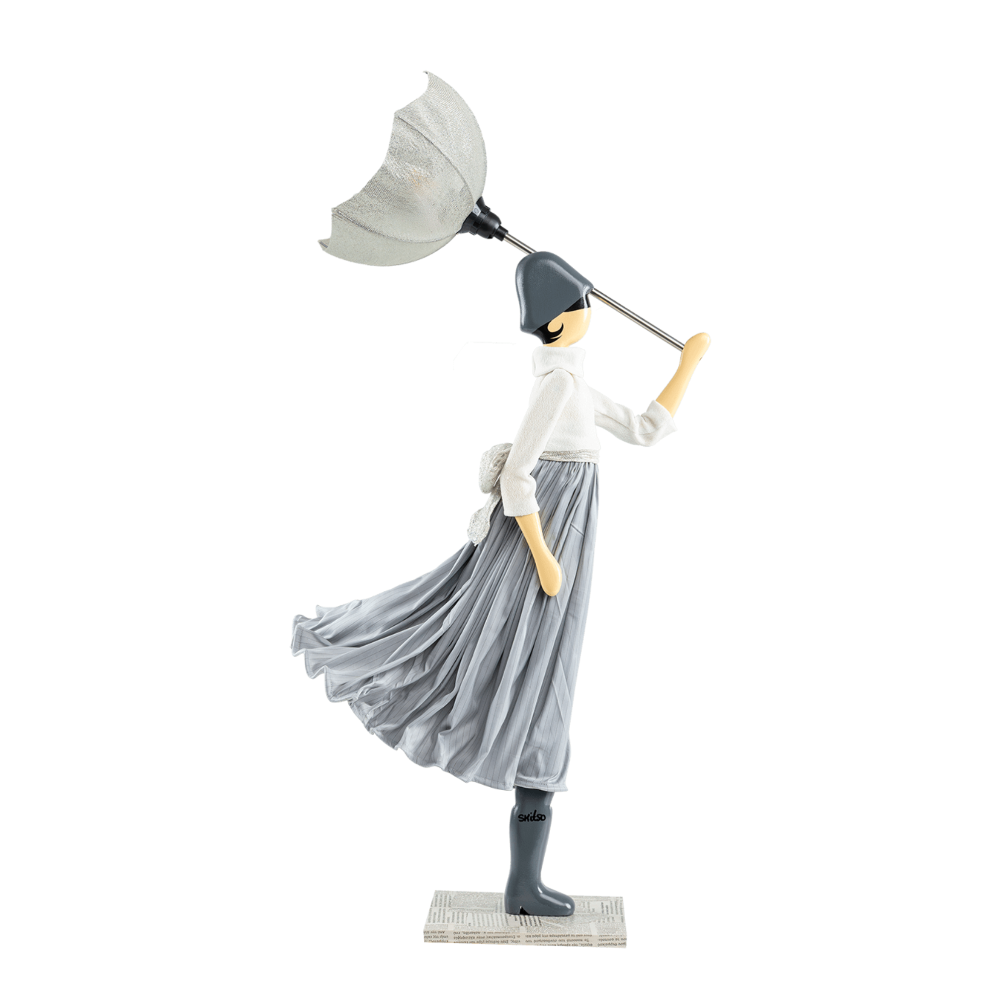 The Skitso Arwen Table Lamp is a piece of handcrafted design that combines elegance and a poetic aesthetic. With a silhouette inspired by the feminine form, Arwen wears a dress in delicate shades of blue-gray and white, embellished with an elegant bow at the waist that accentuates her refinement. The skirt features a finely crafted striped pattern and appears to move gently, while the clear lampshade diffuses a soft, welcoming light. Handcrafted from solid wood and fine fabrics, this decorative lamp adds character and an atmosphere of refined tranquility to the living room, bedroom, or study. Perfect for those who wish to illuminate spaces with style and a touch of artistic grace.