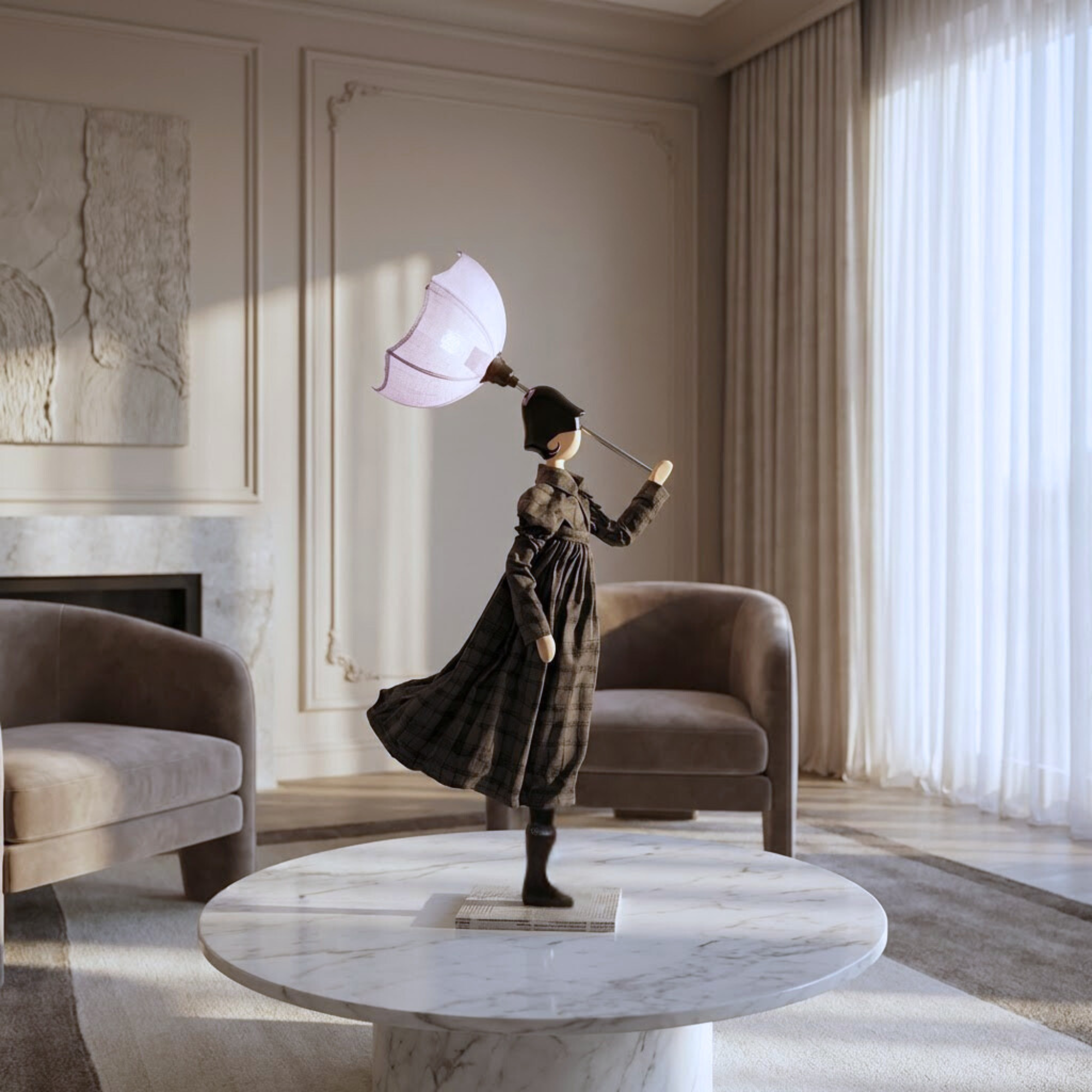 The Ekavi table lamp by Skitso is an elegant expression of artisanal design, characterized by a delicate and timeless style. The slender figure wears a dress in harmonious, neutral tones, enriched with exquisite textile details and a light silhouette that conveys balance and grace. The clear lampshade diffuses a soft, enveloping light, ideal for creating an intimate and refined atmosphere. Perfect for the living room, bedroom, or study, the Ekavi lamp discreetly adds personality to spaces, adding a poetic and sophisticated touch to home decor.