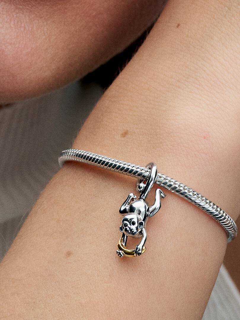 Pandora Essence Collection Monkey with Moving Legs Pendant Charm in 925 Sterling Silver and Exclusive Metal Blend with 14K Gold Plating; 2 Round Brilliant Cut Black Crystals in Bezel Setting; 1 Round Brilliant Cut Colorless Cubic Zirconia