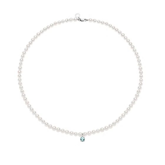 Collana Comete Gioielli da donna in oro 750‰ con filo di perle Acquadolce Ø 4,5/5 mm, arricchita da pendente in Acquamarina tonda da 45 punti carato e diamante da 1,5 punti carato. Parte della Collezione Fantasia di Perle, unisce eleganza e delicatezza in un design senza tempo. Lunghezza 42 cm con chiusura a moschettone Comete e stella portafortuna.