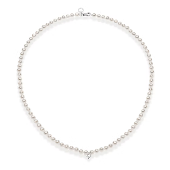 Collana Comete Gioielli da donna in oro 750‰ con filo di perle Acquadolce Ø 4,5/5 mm, impreziosita da un diamante da 5 punti carato. Parte della Collezione Fili Perle Acquadolce, unisce eleganza e luminosità in un design raffinato e senza tempo. Lunghezza 42 cm con chiusura a moschettone Comete e stella portafortuna.